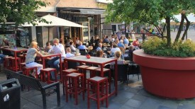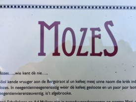 Na wat rondlopen en proberen op andere terrassen (druk, weinig schaduw, geen plek) kozen we voor Mozes. Meteen al leuk doordat men er aan de Bergstraat een kei voor de deur heeft staan die wordt vastgehouden door twee metalen staanders. Leuker was natuurlijk een opengemaakte zee of zo, maar daar zal men geen vergunning voor hebben gekregen. Die steen staat vermoedelijk voor het Stenen verbond uit de Bijbel of die ene steen die uiteindelijk de tien geboden bevatte volgens dat heilige boek. Hoe dan ook, het terras lag aan de westkant van het pand en daar was nog wat plek. Ondergaande zon, beetje wind, gezellige sfeer.