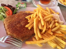 Niet alleen door de malsheid, maar ook omdat het ding zelf zat volgestopt met ham en kaas als een Gordon Blue. Daarbij heerlijke verse frietjes en wat salade als dressing. Het was niet alleen ‘werken’ om dat enorme stuk vlees weg te werken, zonder ook maar iets af te doen aan de kwaliteit trouwens, je wilt ook niet dat de boel koud wordt. Nou, dat werd het niet. Bloedheet, zoals het hoort en gewoon genieten van alles om je heen. Die Rijnboulevard in Emmerich is veelal rustig, en de enige passanten die er passeren zijn vaak Nederlandse of Duitse dagjestoeristen op de fiets. Er wonen volgens mij vooral pensionado’s in de appartementen en flats aan die boulevard en die wandelen er ook wat op en neer.