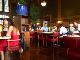 Het was aan een lieve vriendin te danken dat we met een stukje korting konden gaan dineren bij dit erg aardig gelegen restaurant in het Amsterdamse Centraal Station. Waar vroeger vermoedelijk de eerste klas treinreizigers aan de sherry zaten voor ze vertrokken heeft een exploitant nu een sfeervol en uitgebreide horeca-gelegenheid ingericht, naast het hoofdspoor van Amsterdam naar Utrecht en verder. Omdat we die dag in de stad een belangrijk dokument hadden ondertekend met een feestelijk randje, de aanleiding beschreef ik al eerder, besloten we om dit cadeau gegeven stukje korting om te zetten in eetbare waar. In dat restaurant met die veel zeggende naam 1e Klas. Zoals beschreven is de lokatie de naam meer dan waard.
