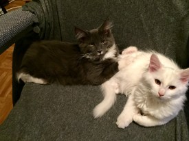 Sinds januari, ik heb u als lezer indertijd meegenomen in onze wereld van kattenliefde en verdrijven van toenmalig heftig verdriet, hebben wij twee jonge gasten in huis. Broer en zus, Main Coon katten van de leuke en (gelukkig meestal)gezonde soort. In de tussenliggende maanden groeiden die twee in rap tempo op. De socialisering werd deels door onze iets oudere (2 jaar) Ragdollkater Prins Percy gedaan, de rest probeerden wij als butler en dienstmeisje die twee bij te brengen. Met een kattenervaring die toch al een dikke halve eeuw teruggaat weet je dan wel wat je in de poezenkuip aantreft zou ik denken. Maar in dit geval pakt(e) dat toch iets anders uit. Het groeiproces van deze twee gaat zo rap dat ze als 8 maanden oude kittens op enig moment 4 resp. 5 kilo wogen. Het hoort bij het ras en dat verschil in gewicht zit ook in geslachtsonderscheid. Vrouwtjes bij deze kattensoort lichter dan de mannetjes. Maar er is nog iets wat ons toch wat parten speelt.