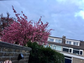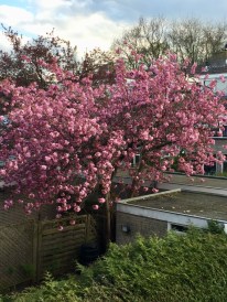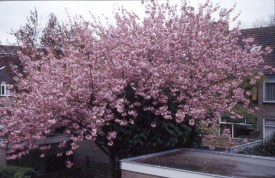 Toen wij hier, lang geleden alweer, kwamen wonen kregen we als gratis accessoire bij ons huis een boom bij de buren die elk jaar zo’n beetje in de eerste twee weken van april tot volle bloei komt of kwam. Prachtig! En onze oude buurvrouw genoot daar net als wij intens van. Omdat deze boom een ver familielid kent die bij een overbuur ooit is geplant en daar net even later ook in de bloei komt en dan een andere bloesemkleur laat zien, is het voorjaar voor ons daardoor altijd extra zicht- en tastbaar. Overigens relatief kort. Juist in het voorjaar wil het naast aardig weer ook vaak waaien en regenen en dan is diezelfde boom een bron van wat ergernis. Immers de honderdduizenden blaadjes dwarrelen dan neer als sneeuwvlokken en kleuren diverse tuinen eerst aardig roze, daarna bruin tot zwart. Je veegt je een ongeluk, maar ach, dat heb je er voor over uiteraard. Ik maakte de lezer(es) al eerder deelgenoot dat de oude buurvrouw een paar jaar geleden is gaan hemelen.