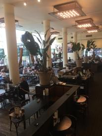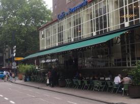 Als je dan in Rotterdam bent wil je ook wel even een terrasje opzoeken en iets lekkers eten en/of drinken. Dat lukte ons bij Dudok, een zaak die schuin tegenover de modelwinkel van Meijer en Blessing te vinden is aan de Westewagenstraat. De keuze werd door de jonge generatie in ons gezelschap bepaald, maar wat waren we achteraf gezien blij daarmee. Het gaat om een horecabedrijf dat naar verluid is gevestigd in een oud kantoorpand van Nationale Nederlanden en typisch de styling laat zien van de jaren vijftig. Om het hele gebouw heen zijn terrassen te vinden (in de zomer) en de bediening daar was vlot en vriendelijk tot vrolijk. Men biedt een aardig oeuvre aan gerechten en drankjes en die zijn van de smakelijke soort. Wij namen alle vier iets anders, dan was vergelijking goed mogelijk. De gezichten van de eters spraken boekdelen, goede keuze, lekkere gerechten.