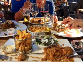 Onze eerder beschreven trip met de Soester vriendjes naar Hoorn bracht ons traditiegetrouw ook weer een gezamenlijk dinertje, dat wij dit keer haalden bij Restaurant-café Ridderikhoff aan de Roode Steen in Hoorn. Recht tegenover het al eerdergenoemde Noord-Hollands-Museum en het beeld van JP Coen, exploiteert dit bedrijf een behoorlijk terras. Tafels en stoelen staan relatief dicht op elkaar, je moet dus even passen en meten om er met vier man te kunnen eten zonder anderen aan te stoten. Maar ja, de bediening maakte veel goed. Men werkt hier deels met mensen die een geestelijke achterstand bezitten, maar de servicegraad is zodanig dat je dit helemaal niet merkt. Men is domweg aardig, efficiënt, en het eten is prettig van prijs en buitengewoon van kwaliteit. Op deze dag waren de hoofdgerechten in de aanbieding. Prima prijsje, en wat we geserveerd kregen was lekker.