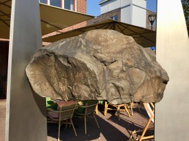 Na wat rondlopen en proberen op andere terrassen (druk, weinig schaduw, geen plek) kozen we voor Mozes. Meteen al leuk doordat men er aan de Bergstraat een kei voor de deur heeft staan die wordt vastgehouden door twee metalen staanders. Leuker was natuurlijk een opengemaakte zee of zo, maar daar zal men geen vergunning voor hebben gekregen. Die steen staat vermoedelijk voor het Stenen verbond uit de Bijbel of die ene steen die uiteindelijk de tien geboden bevatte volgens dat heilige boek. Hoe dan ook, het terras lag aan de westkant van het pand en daar was nog wat plek. Ondergaande zon, beetje wind, gezellige sfeer.