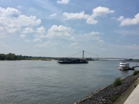 Niet alleen door de malsheid, maar ook omdat het ding zelf zat volgestopt met ham en kaas als een Gordon Blue. Daarbij heerlijke verse frietjes en wat salade als dressing. Het was niet alleen ‘werken’ om dat enorme stuk vlees weg te werken, zonder ook maar iets af te doen aan de kwaliteit trouwens, je wilt ook niet dat de boel koud wordt. Nou, dat werd het niet. Bloedheet, zoals het hoort en gewoon genieten van alles om je heen. Die Rijnboulevard in Emmerich is veelal rustig, en de enige passanten die er passeren zijn vaak Nederlandse of Duitse dagjestoeristen op de fiets. Er wonen volgens mij vooral pensionado’s in de appartementen en flats aan die boulevard en die wandelen er ook wat op en neer.
